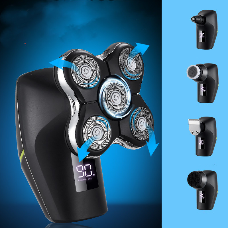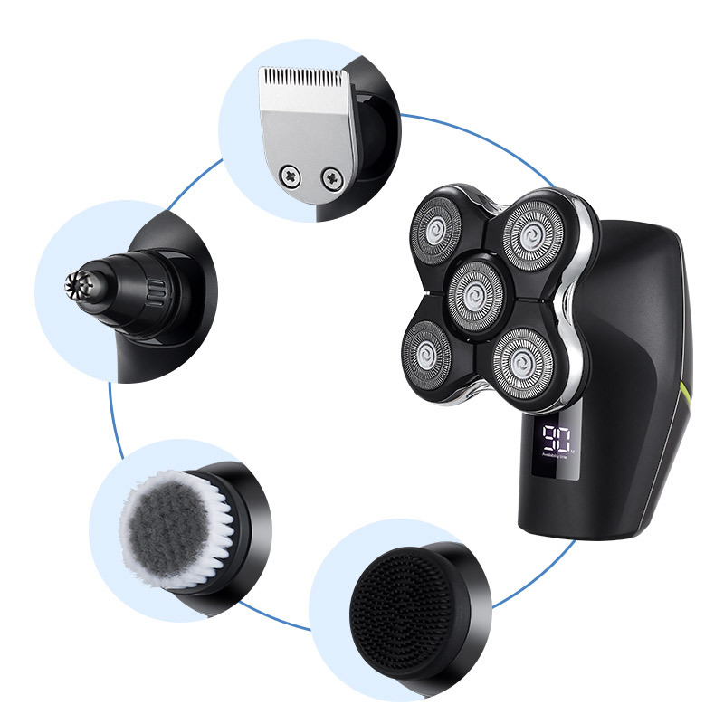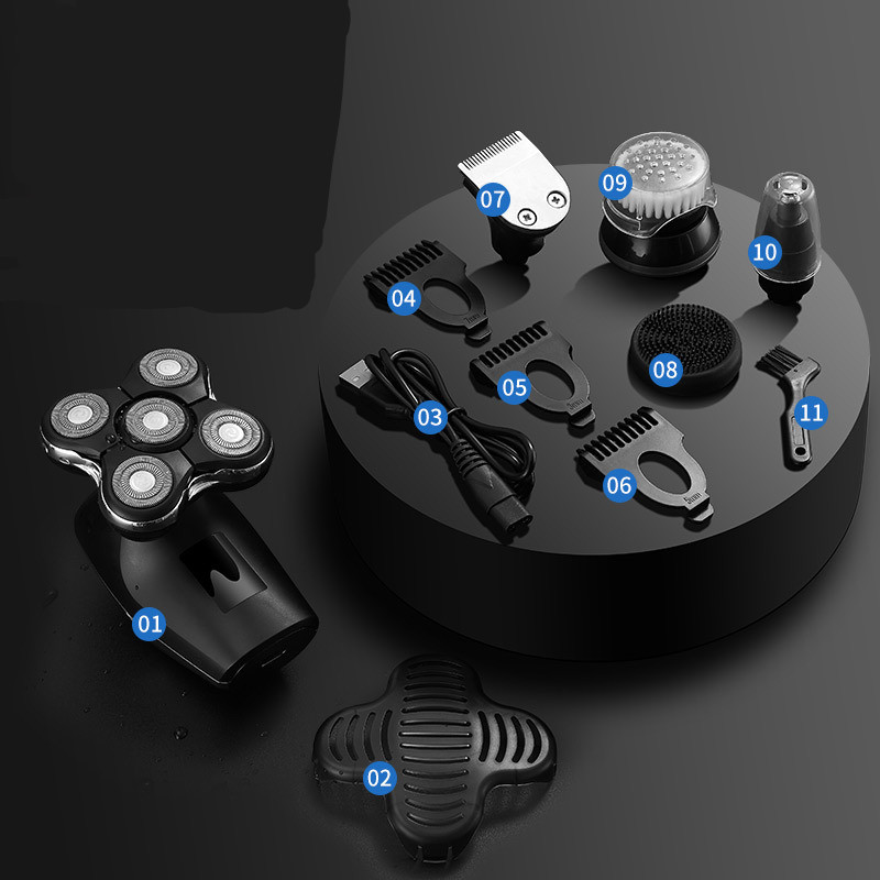 Product accessories: body + 5D shaving head + barber head + nose hair head + massage head + cleansing device + English manual + limit comb *3 (3, 5, 7mm) + cleaning brush + USB charging cable + Knife Head protection cover.