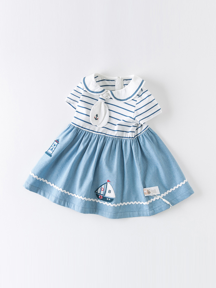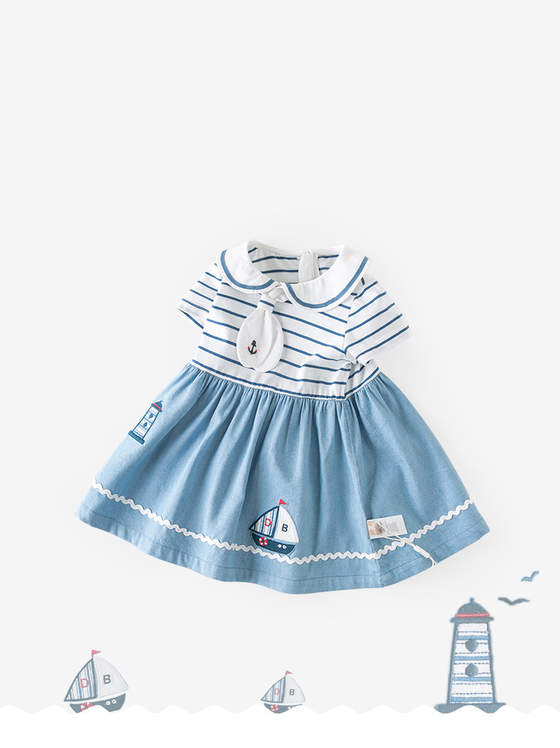 Product color: blue and white stripesCommodity composition: Upper body fabric: 100% cottonSkirt fabric: 67% cotton 33% viscose fiber (except ingredients)Product size: 66cm 73cm 80cm 90cm 100cm110cm 120cm 130cm