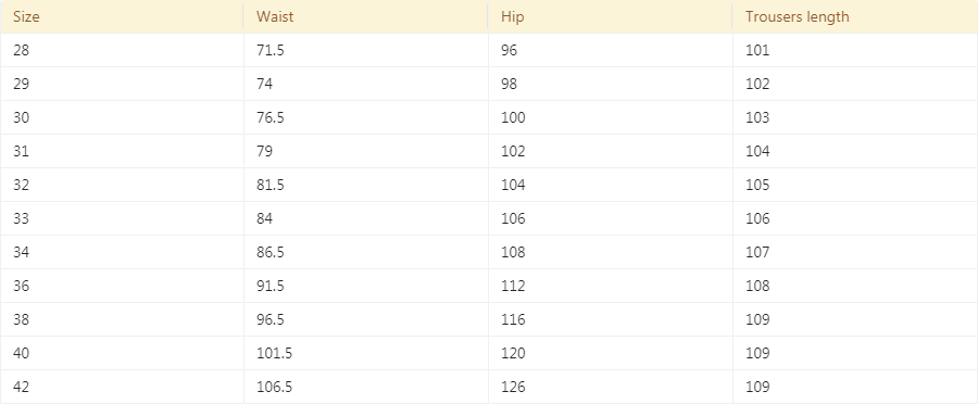 Size: 28, 29, 30, 31, 32, 33, 34, 36, 38, 40, 42