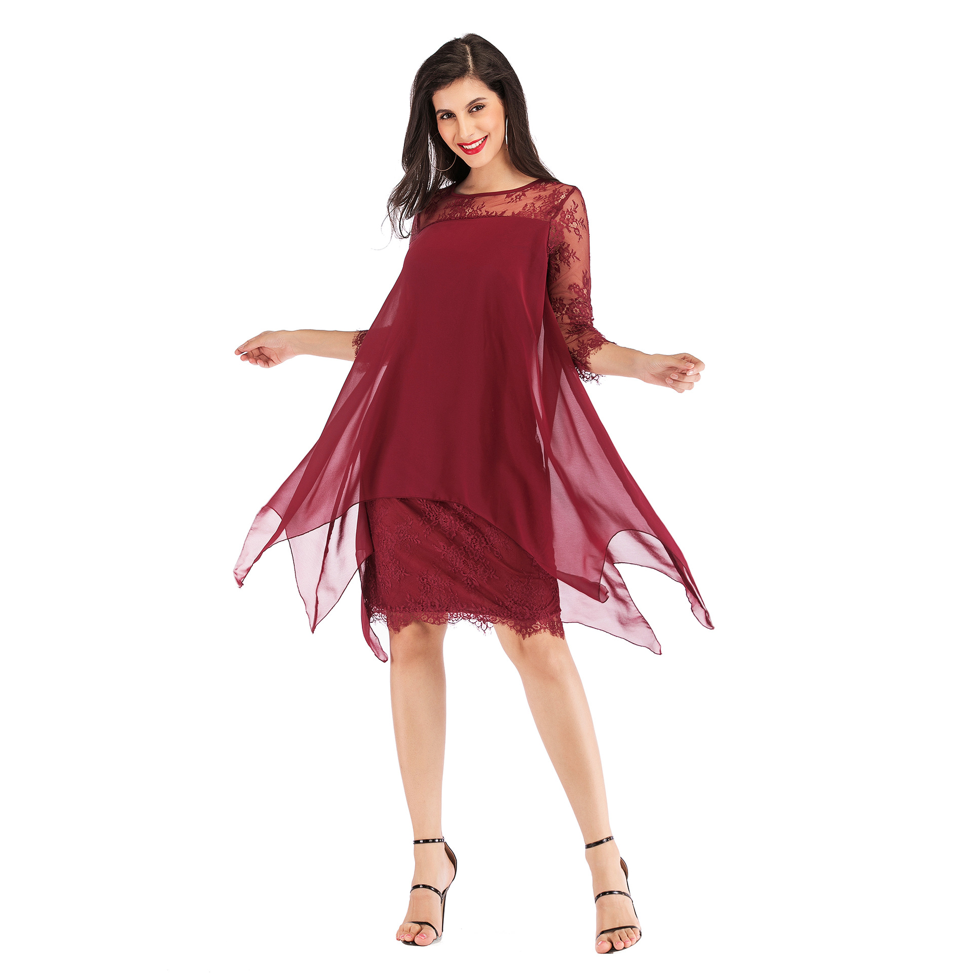 Lace-paneled cropped sleeves in a long knee-length chiffon dress