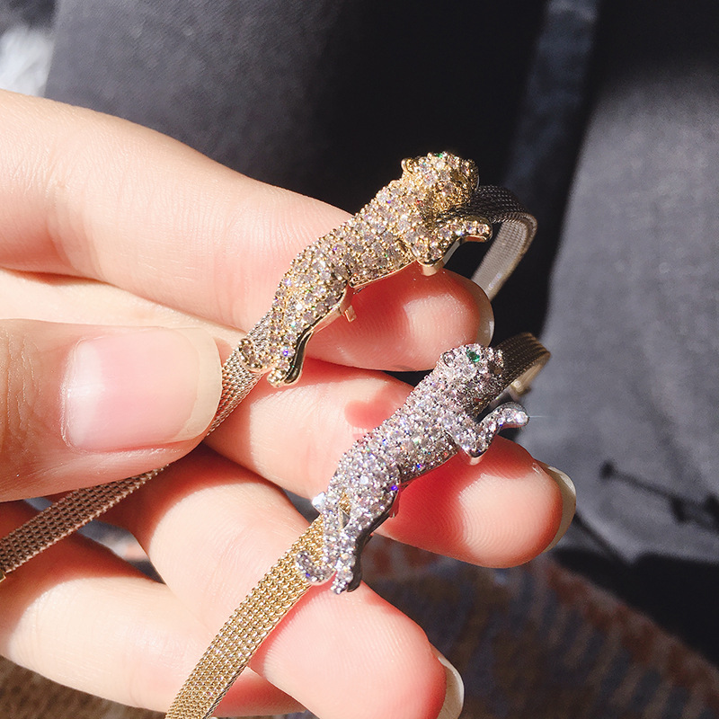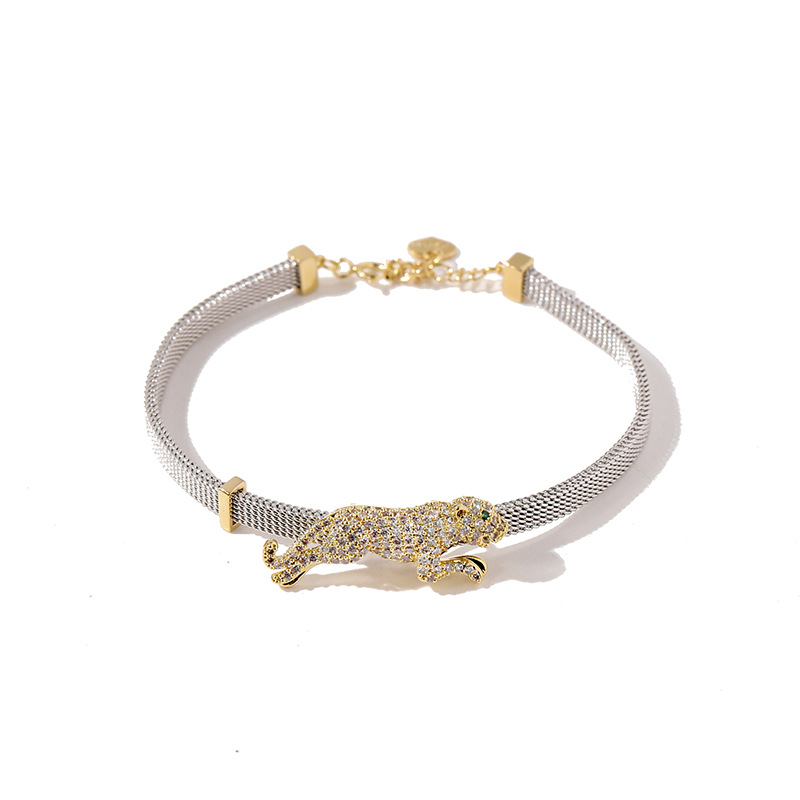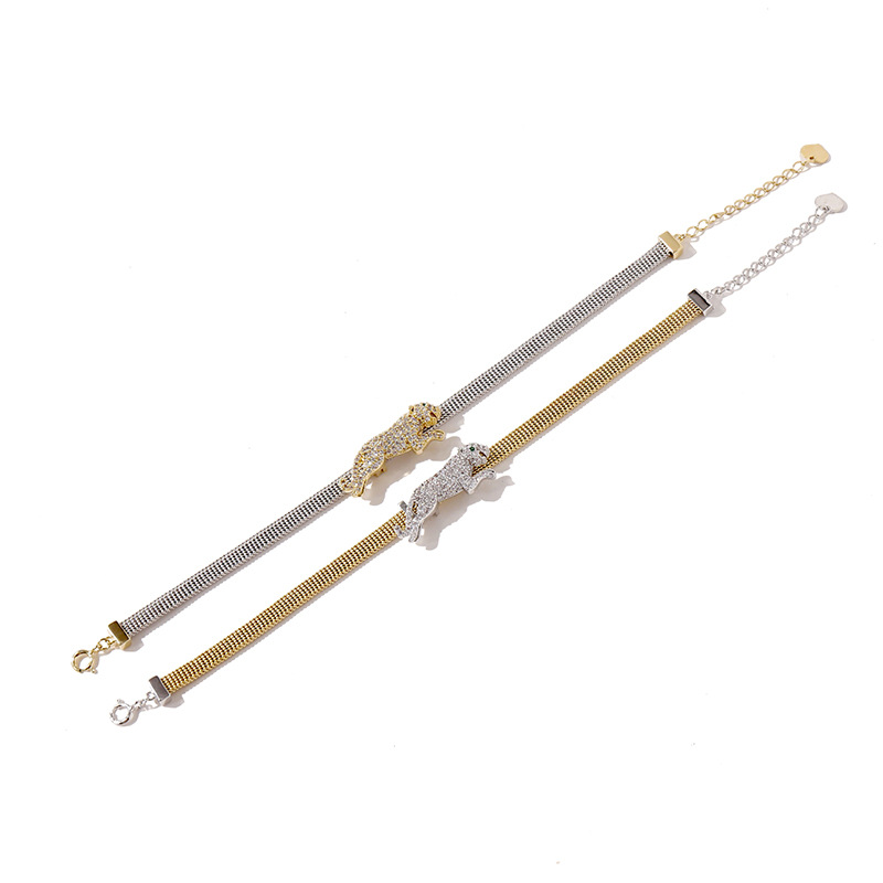 Women's Full Diamond Green Eye Stone Leopard Chain Mesh Bracelet