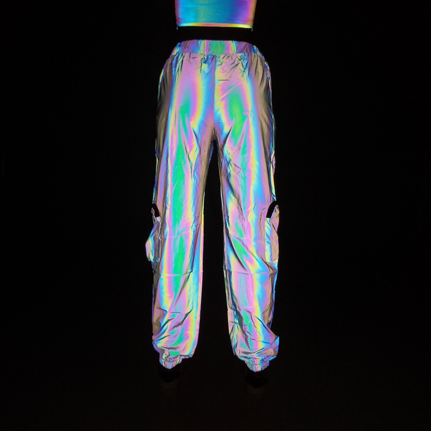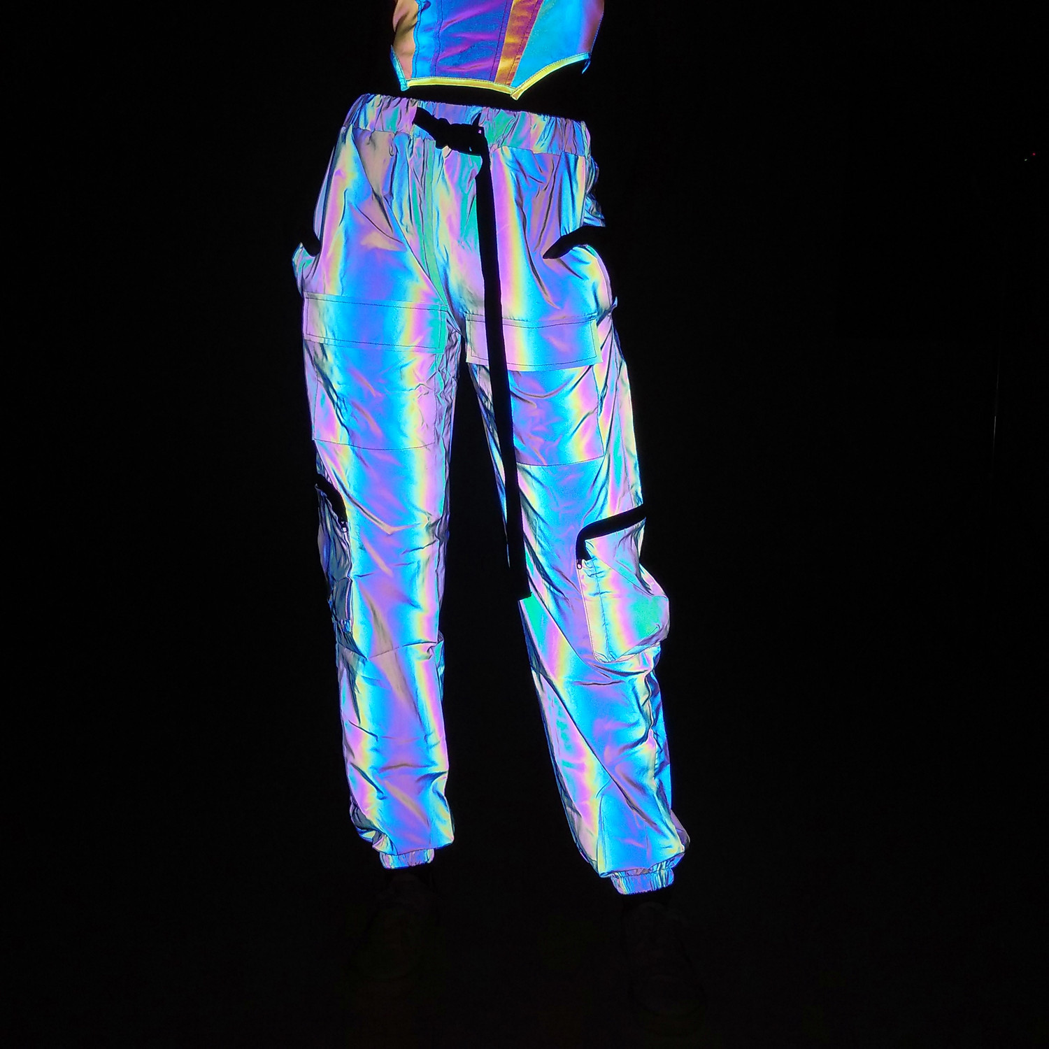 Product information: Color: colorful reflective Size: S,M,L,XL,XXL Style type: Street hipster Popular elements: reflective night vision Style: multi-pocket trousers Fabric name: Polyester Style: tooling style Process: coating