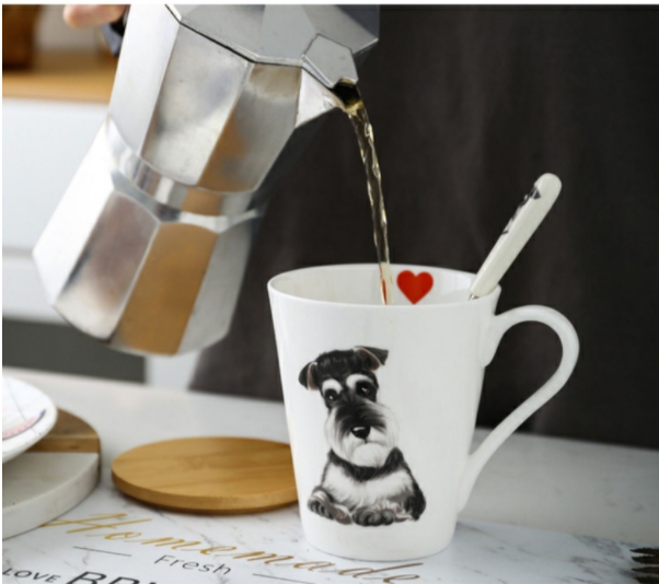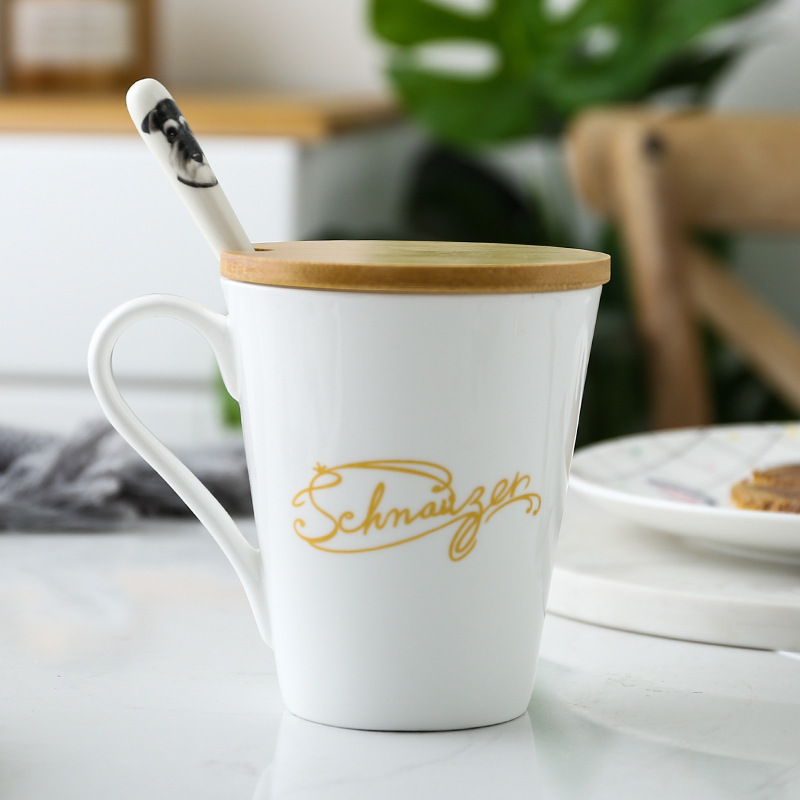 Product: Schnauzer ceramic mugMaterial: ceramic + bamboo cover + stainless steel spoonProcess: high temperature decalCapacity: 450mlSize: Cup 0 diameter 9.6cm, bottom diameter 7cmWith handle width 12.5cm.