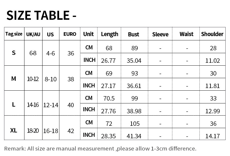 1. Asian sizes are 1 to 2 sizes smaller than European and American people. Choose the larger size if your size between two sizes. Please allow 2-3cm differences due to manual measurement.