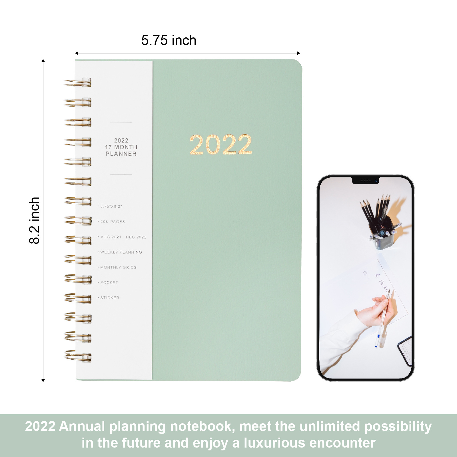 Specifications: 1 Piece 17 Months 2022 Week Planner per pack with pockets and month grid.Dimensions: Approx. 8.2" x 5.2"Pages: 148Material: PU leather + paperColor: Green/Blue