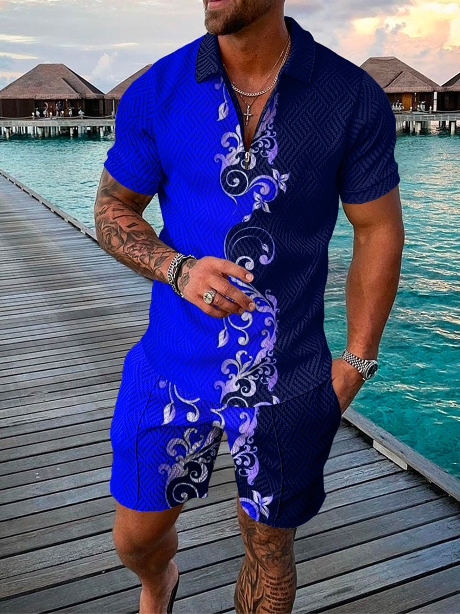 Men's Summer Fashion 3D Printed Short Sleeve Geometric Zip Lapel Shirt Set