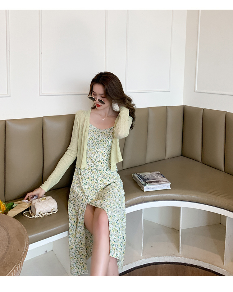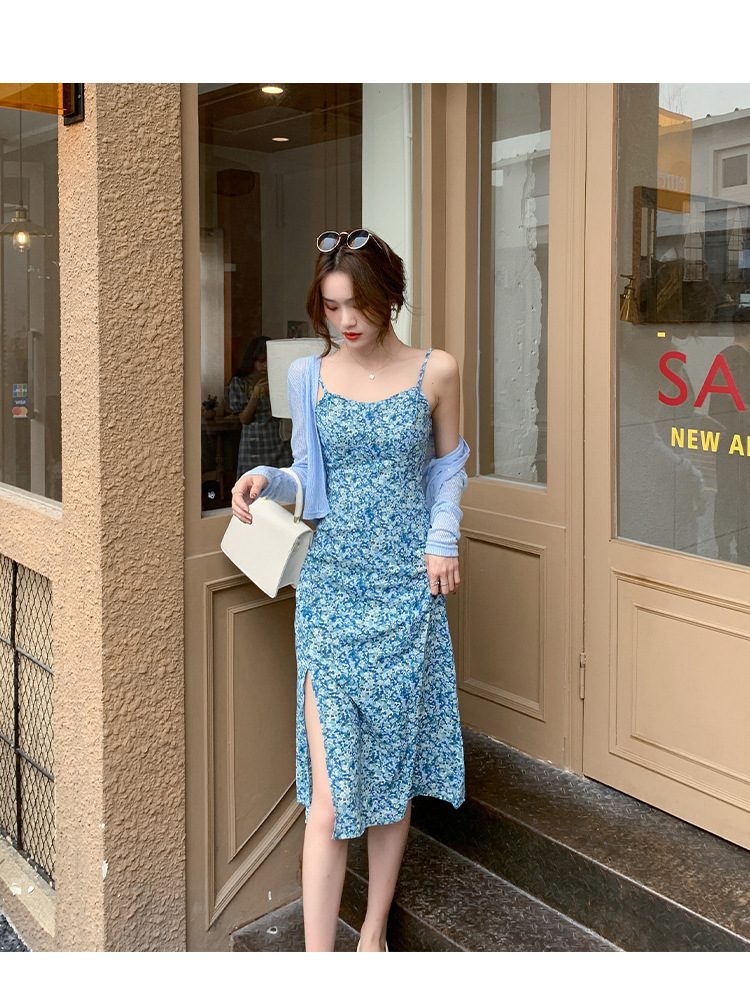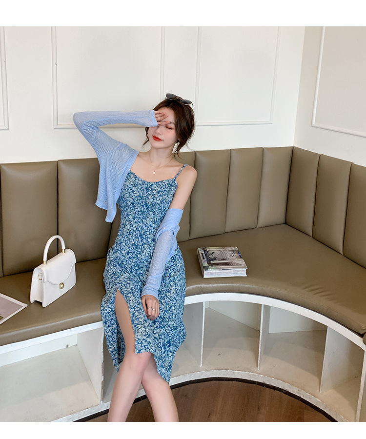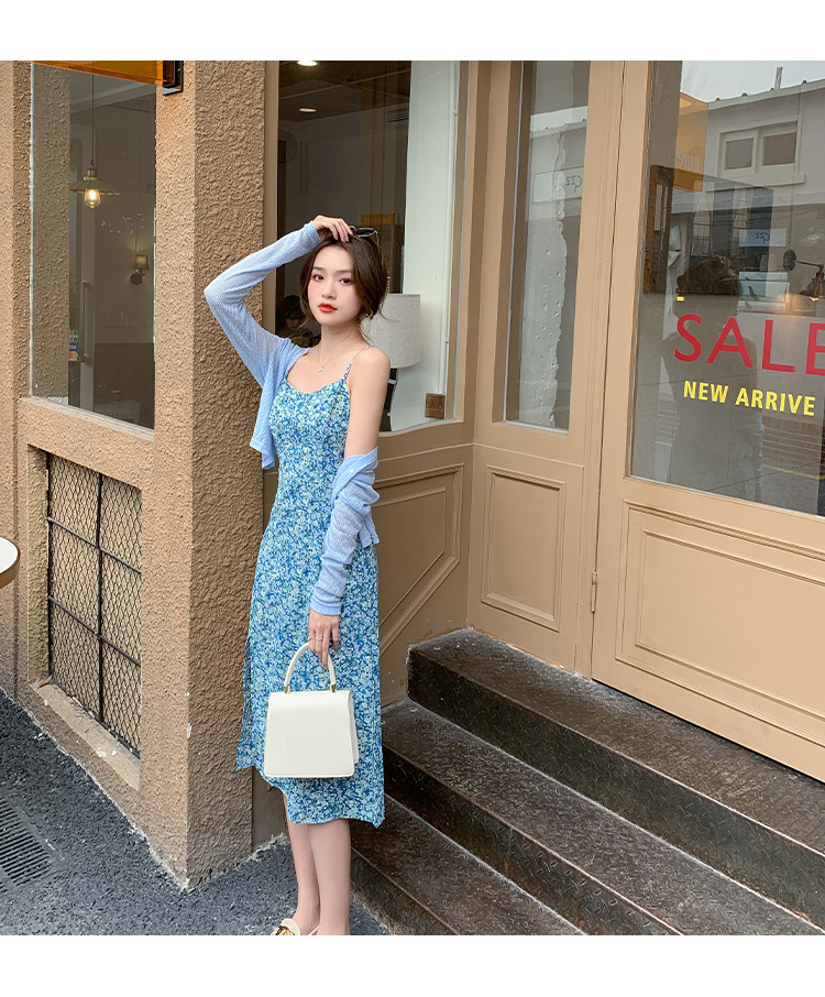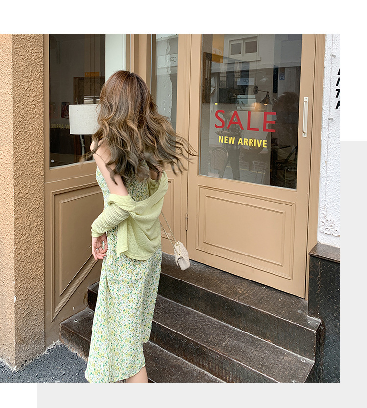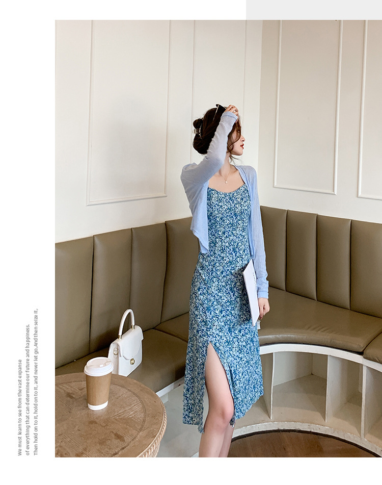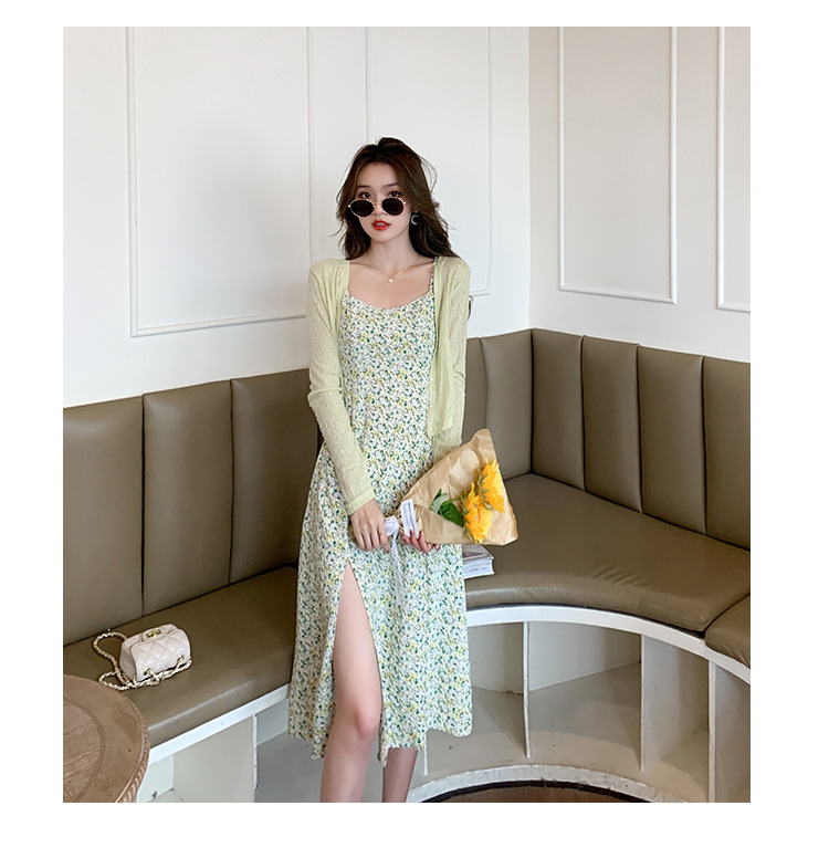 Color: green cardigan, blue cardigan, green suspender skirt, blue suspender skirt
