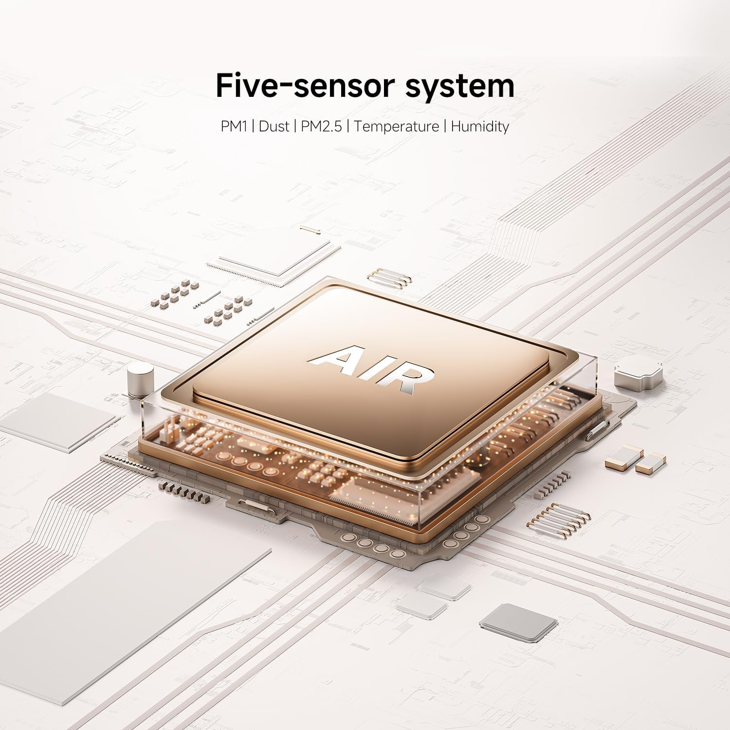 استشعار جودة الهواءنظام من خمسة مستشعرات لتتبع الجسيمات (PM1 و PM2.5)، الغبار، درجة الحرارة، والرطوبة في الوقت الفعلي