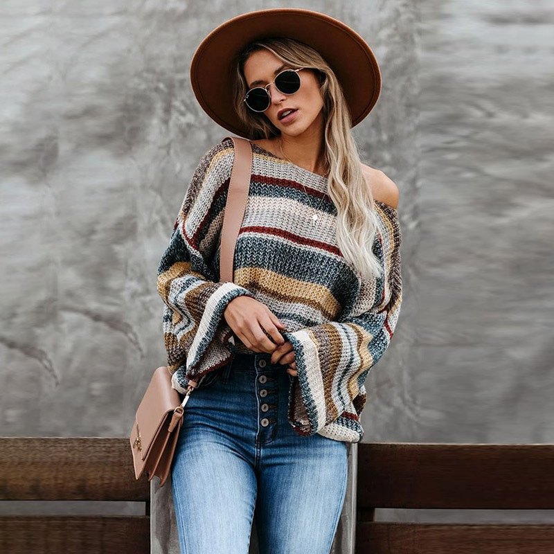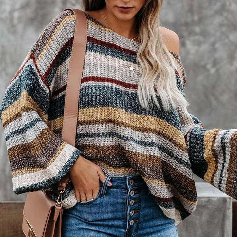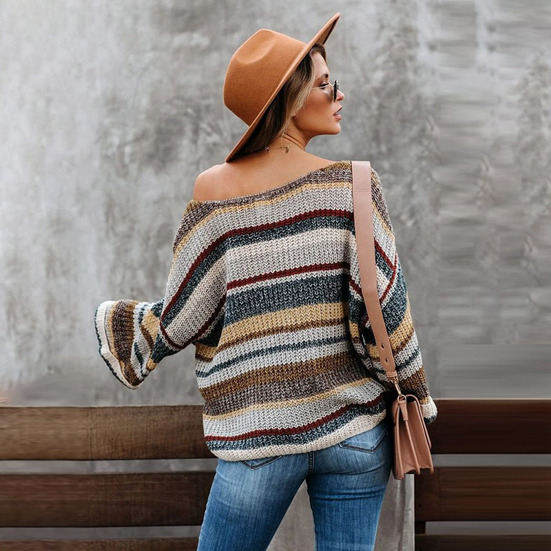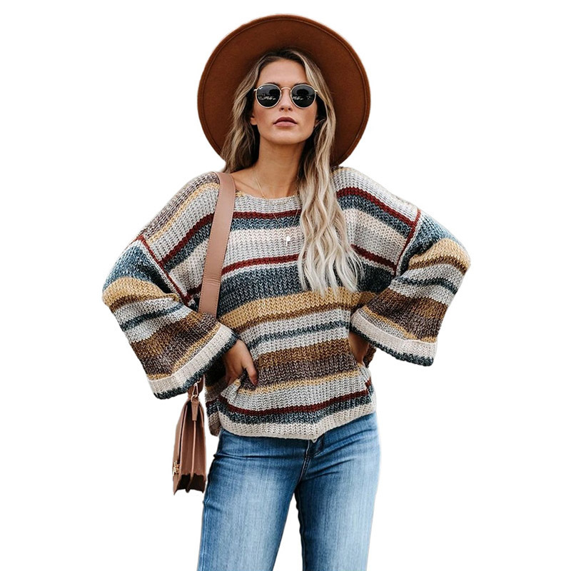 Striped long sleeve loose round neck pullover sweater women