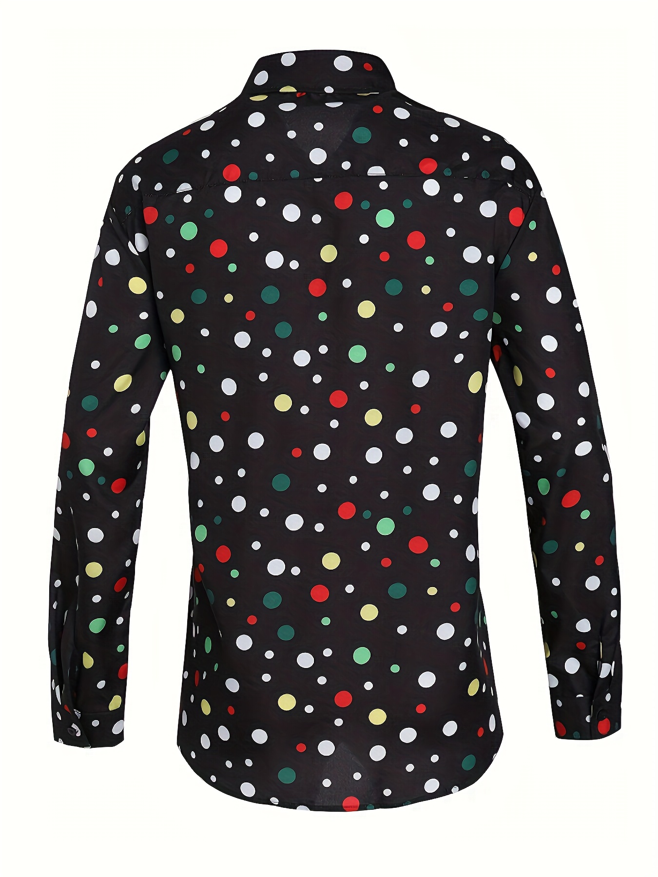 This men's polka dot shirt features a black base with red, green, yellow and white polka dots as accents. Its selling point lies in the sharp contrast of colors, breaking the monotony and easily highlighting individuality and trendiness. The fabric is comfortable and skin-friendly, with both texture and breathability, making daily wear worry-free. This classic shirt silhouette is suitable for various body shapes. The cuffs can be flexibly rolled up, adding a sense of layering and fashion to your outfit.
