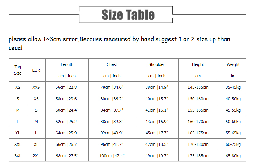 1. Asian sizes are 1 to 2 sizes smaller than European and American people. Choose the larger size if your size between two sizes. Please allow 2-3cm differences due to manual measurement. 2. Please check the size chart carefully before you buy the item, if you don't know how to choose size, please contact our customer service. 3.As you know, the different computers display colors differently, the color of the actual item may vary slightly from the following images.