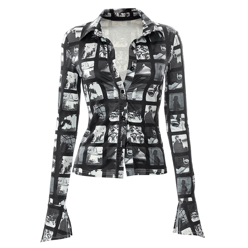 2023 New Printed Lapel Cardigan Single-breasted Long-sleeved Casual Top Shirt