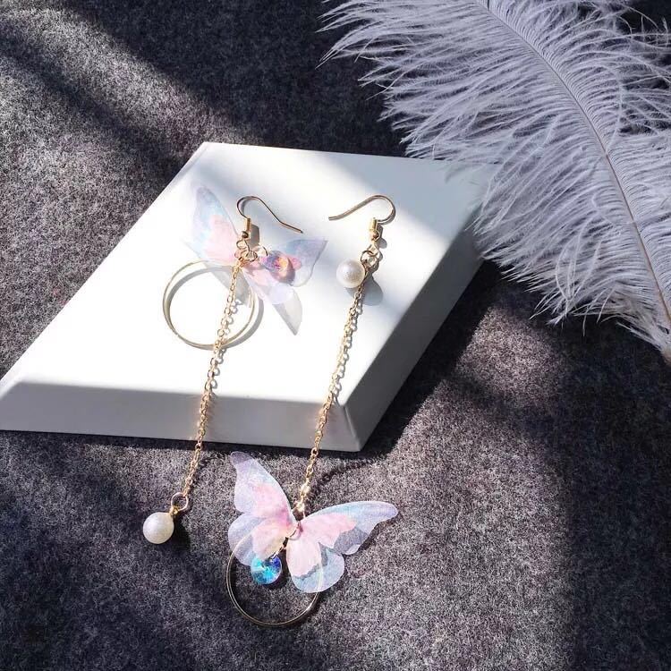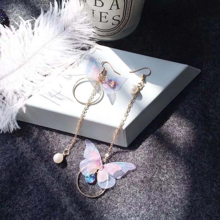 Style: Korean Korean / Korean styleMaterial: Alloy Processing: PlatingCategory: EarringsStyle: Women'sStyling: bowColor; asymmetric fringed butterfly ear hook
