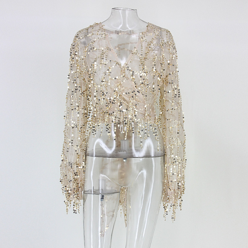 Product Category Lace Shirt Fabric Name Yarn Net Water Soluble Sequins, Other Main fabric composition Polyester (polyester) The content of the main fabric component 81%-90% Style Europe and America Pattern solid color main picture source official picture style cardigan Craft embroidery/embroidery Edition type: Loose Length of clothing (40cm <cloth length ≤ 50cm) Collar type V-neck sleeves Lantern sleeves Sleeve length long sleeve pop elements stitching, sequins, embroidery Color Beige Silver, Apricot Gold Size S, M, L, XL