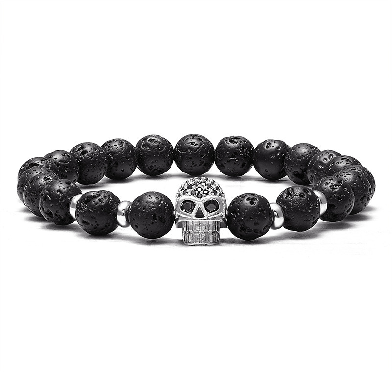 Product information:Type: Bracelet Color: Black, rose gold, gold, silver Material: Glass/glass product name: skull bracelet Product material: Micro-inlaid volcanic rock Product Size: 19cm long Bead diameter: 8mm