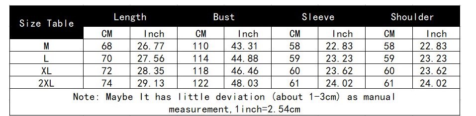1. Asian sizes are 1 to 2 sizes smaller than European and American people. Choose the larger size if your size between two sizes. Please allow 2-3cm differences due to manual measurement. 2. Please check the size chart carefully before you buy the item, if you don't know how to choose size, please contact our customer service. 3.As you know, the different computers display colors differently, the color of the actual item may vary slightly from the following images.