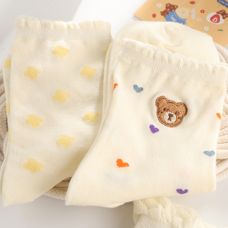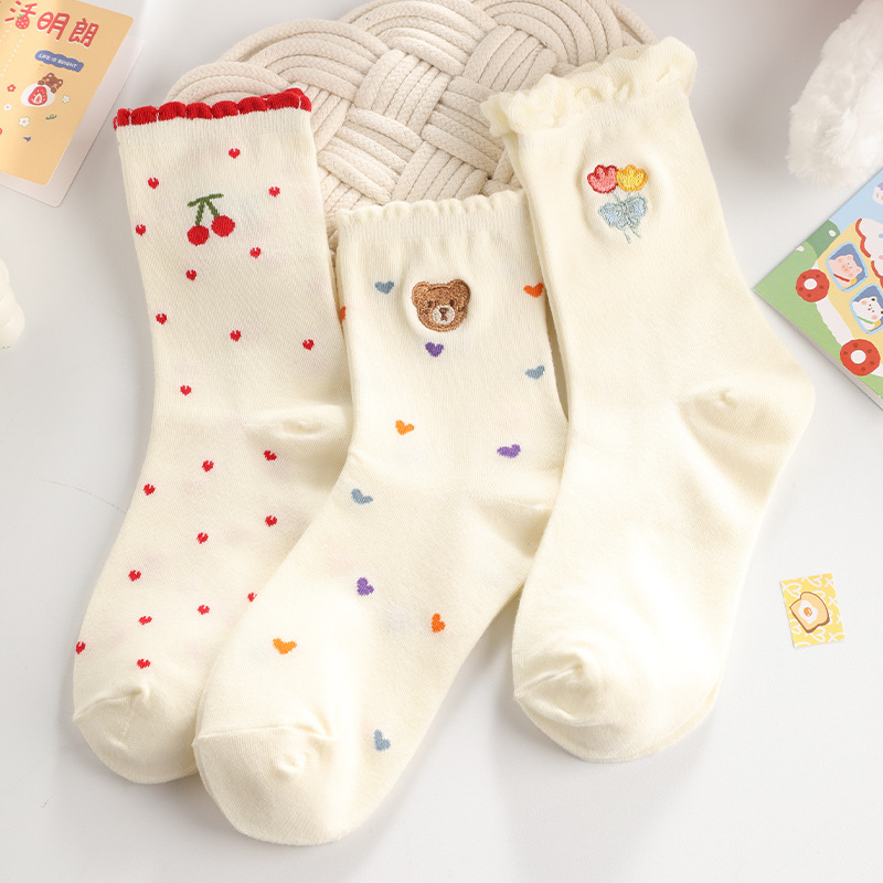 Product information:Color: Love bear, black yellow flower, red and yellow flowers, small yellow star, small cherrySock length: Mid-calfFabric name: CottonMain fabric composition: CottonStyle: Sweet