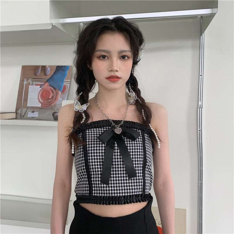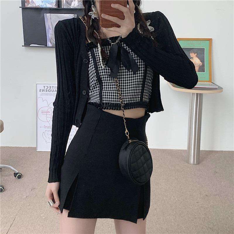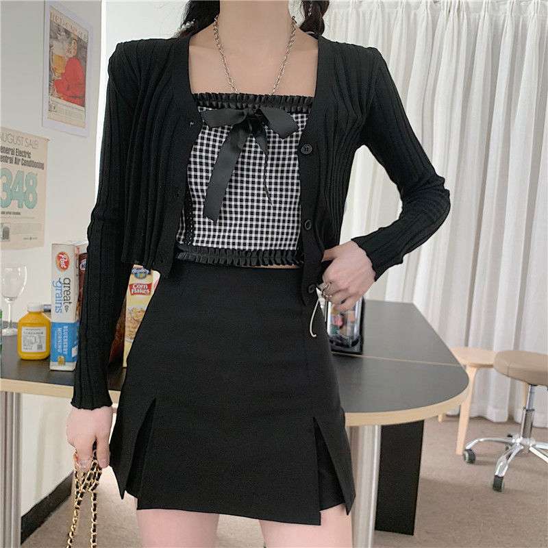 Color: check sling single, black cardigan single, check sling + black cardigan two-piece suit