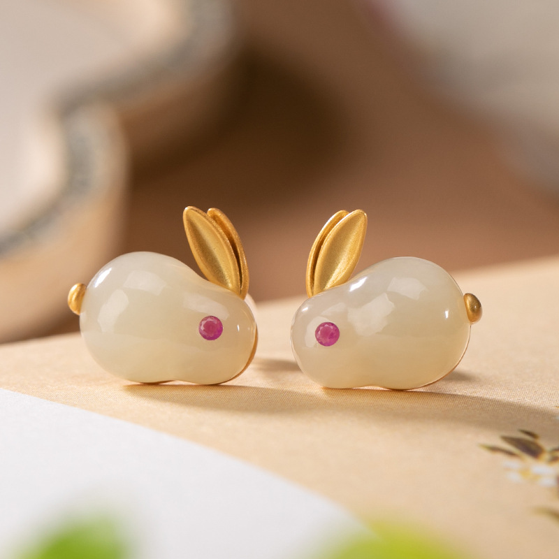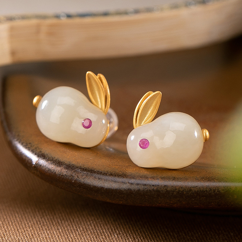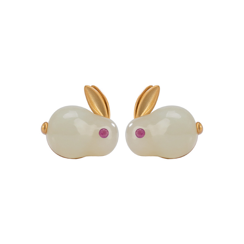 S925 Sterling Silver Plated Natural Gold Hetian Jade Earrings Cute All-match