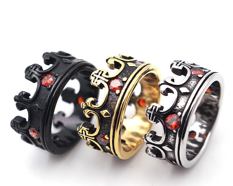 Specifications: The ring pattern is 10mm wide. 316L titanium steel casting.Product description: [Crown Red Diamond Ring] Steel color, black, gold.