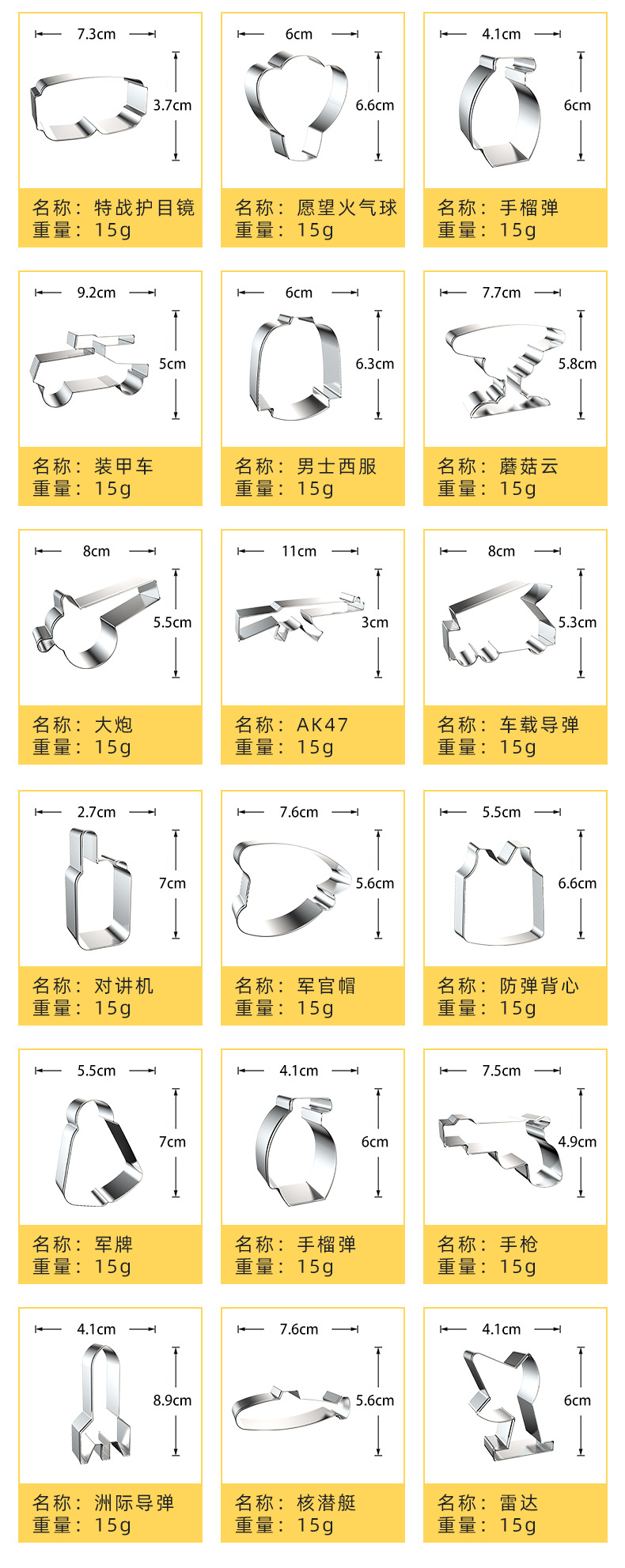 Specifications: Military 9-piece set A, military 9-piece set B, military 9-piece set C, military 9-piece set D, military 9-piece set E, military 9-piece set F