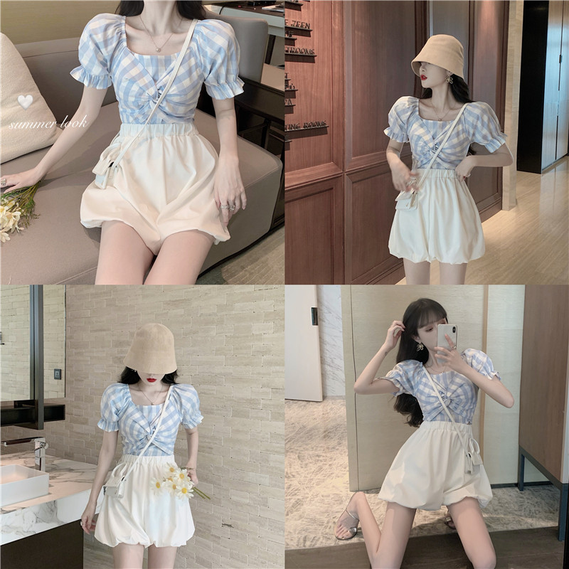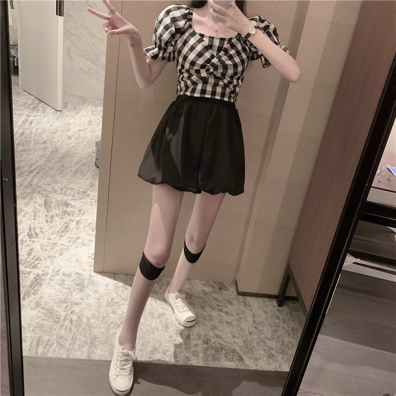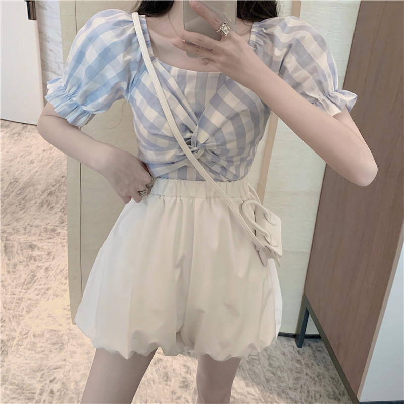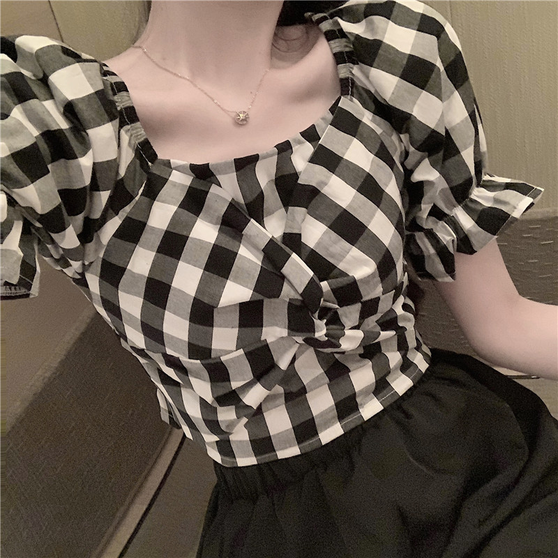 Clothing version type: SlimCollar type: square collarSleeve type: puff sleevesleeve length: short sleevesize: one sizePattern: CheckStyle: Commuter length: short (40cm<length≤50cm)