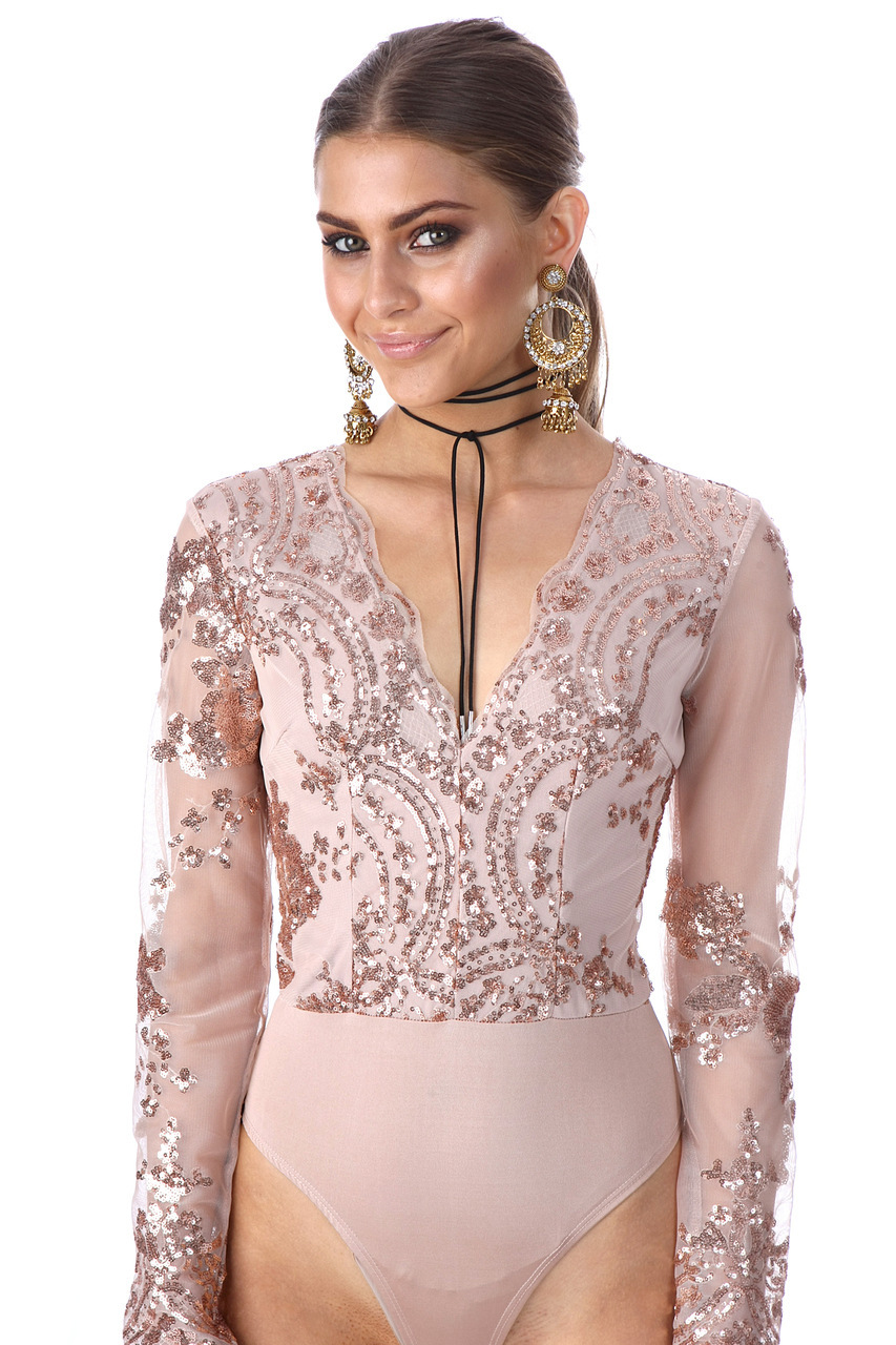 Mesh symmetrical flower-shaped sequins sequins long-sleeved V-neck jumpsuit
