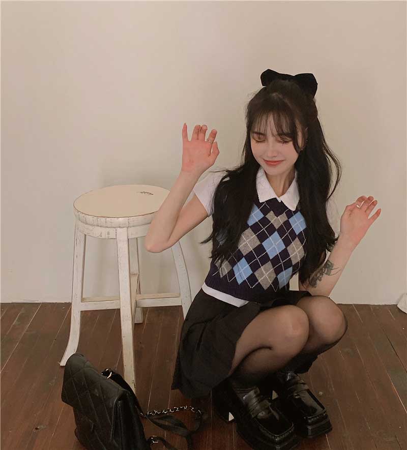 Color classification: White t-shirt, black t-shirt, blue vest, red vest, black pleated skirt