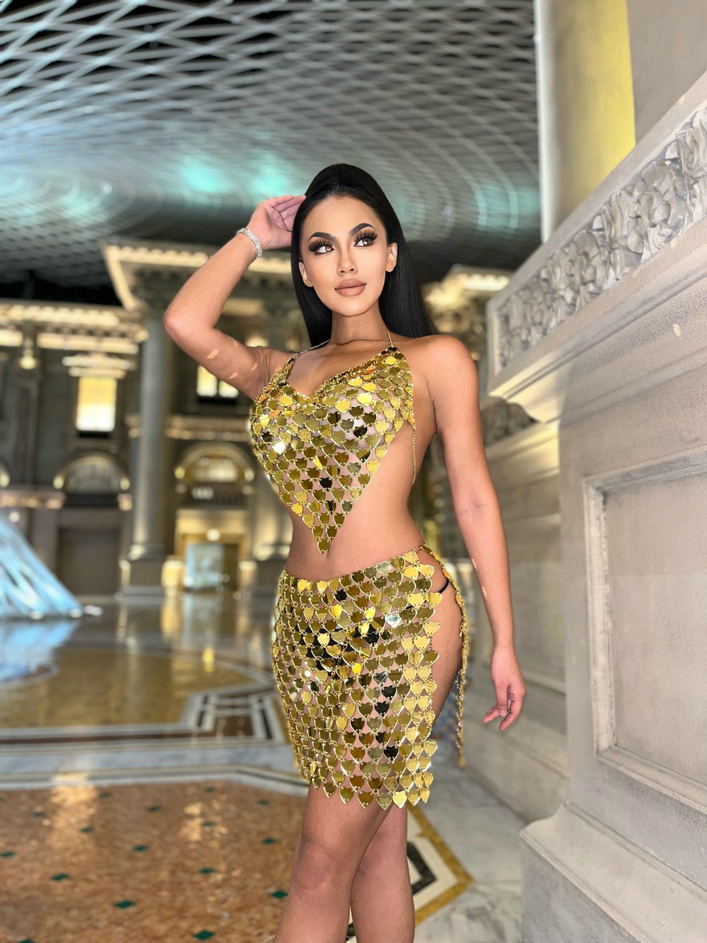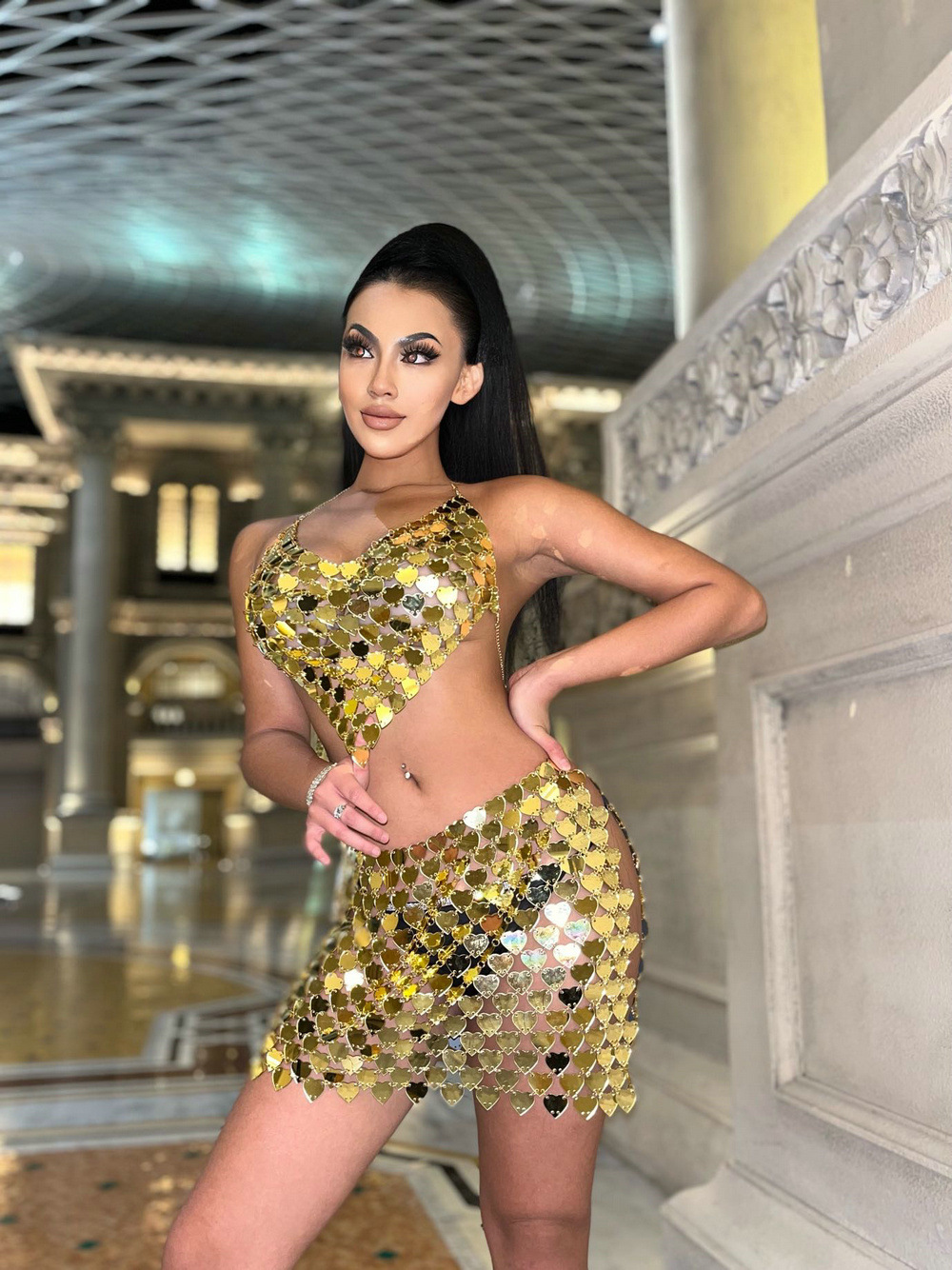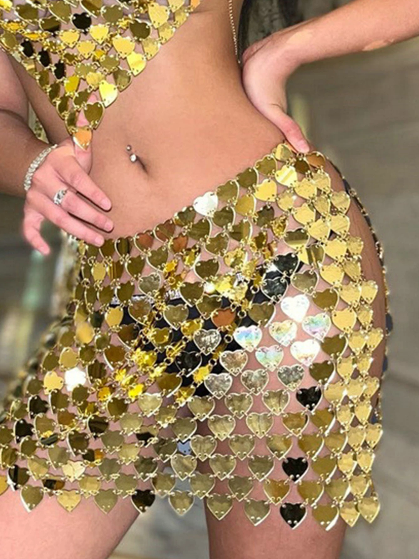 Color: gold top, gold skirt, gold suit