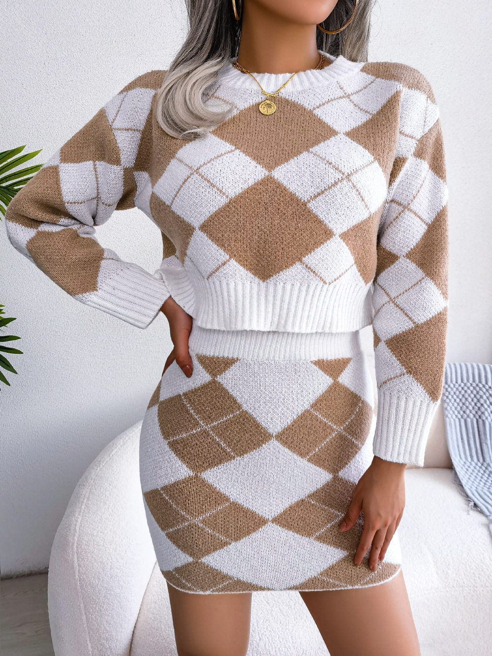 Hit Color Diamond Lattice Midriff-baring Sweater Hip Skirt Casual Suit