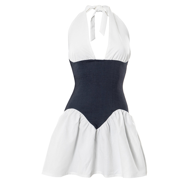 Product information: Color: white Size: S,M,L Style type: temperament commute Popular elements: contrast color Style: Halter Fabric name: 305# faux denim fabric Main fabric composition: Polyester Style: Elegant style