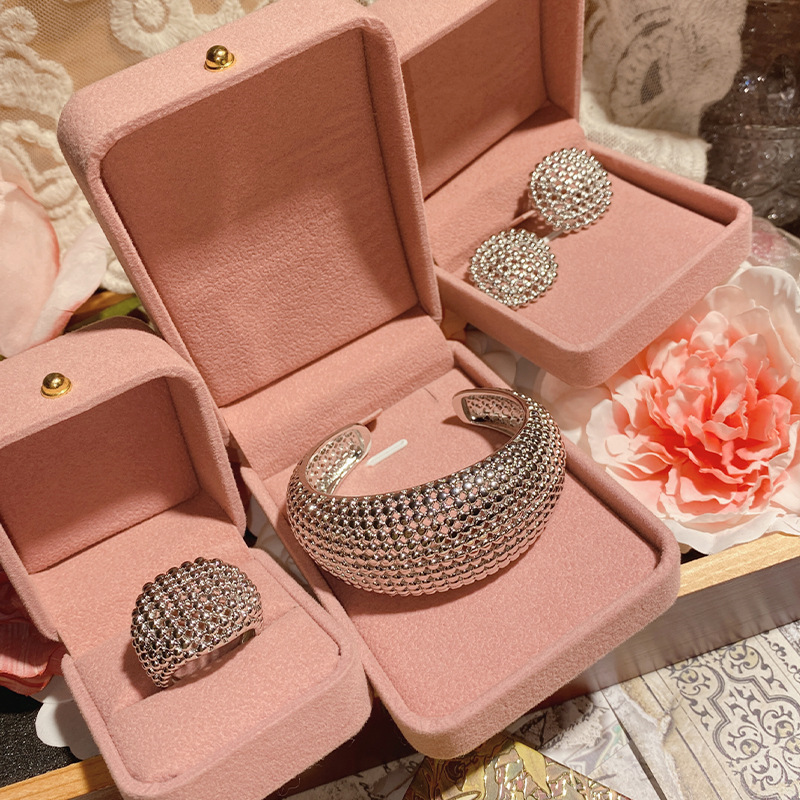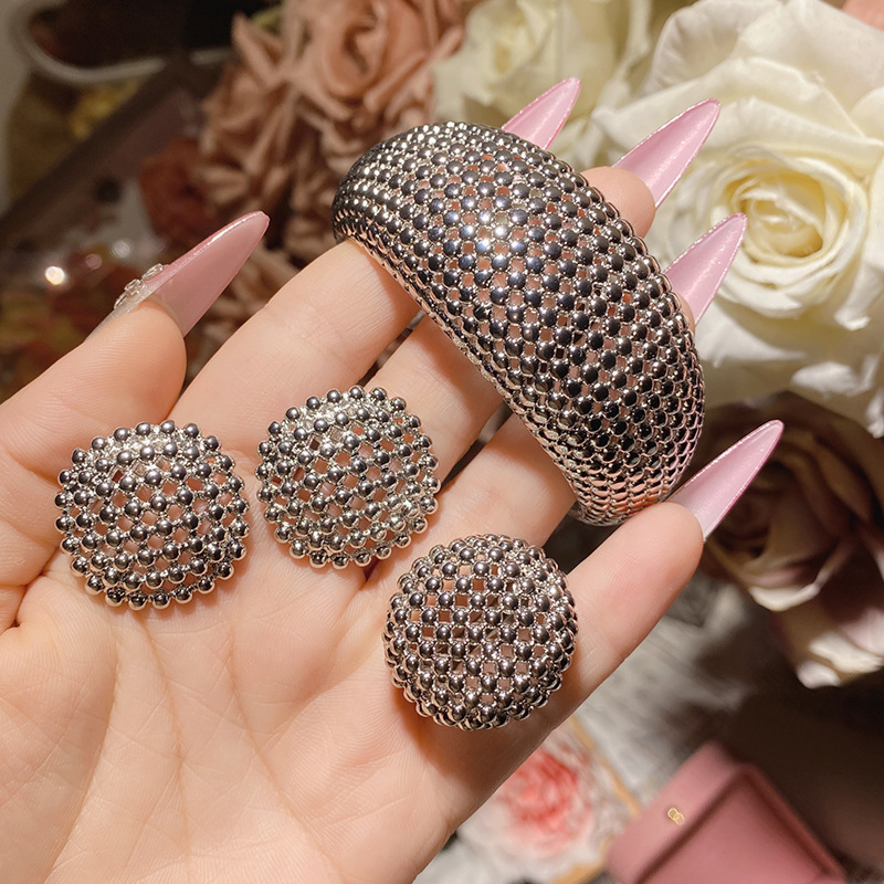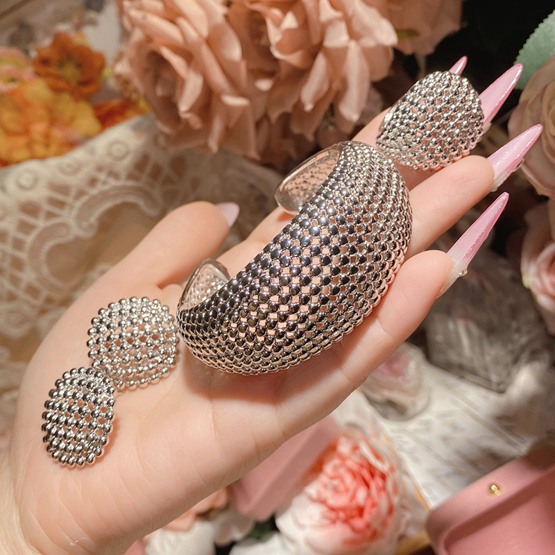 Product information:Treatment Process: inlay Color: ring opening, a pair of ear studs, bracelet Applicable population: Female Material: Copper Popular elements: Grid, grid, Dreamcatcher Style: Exaggerated Suit combination: Jewelry earrings