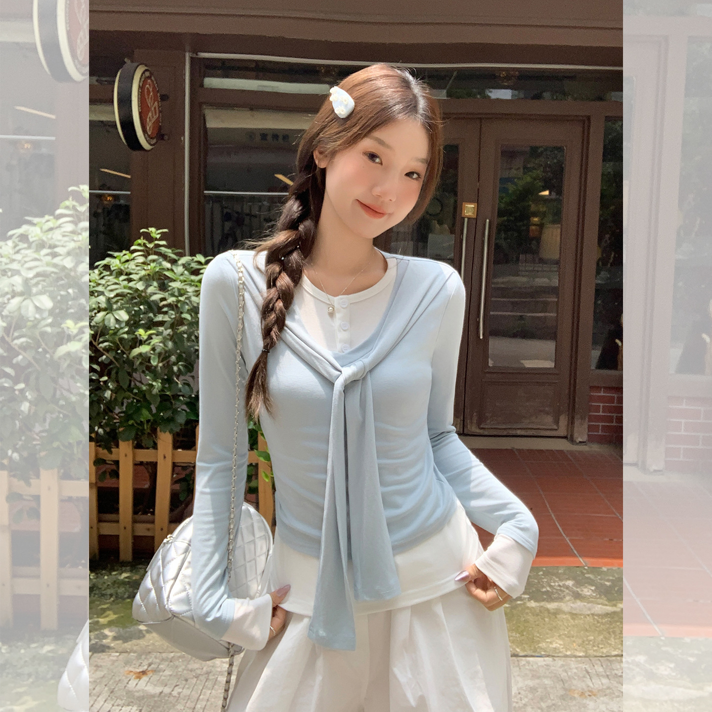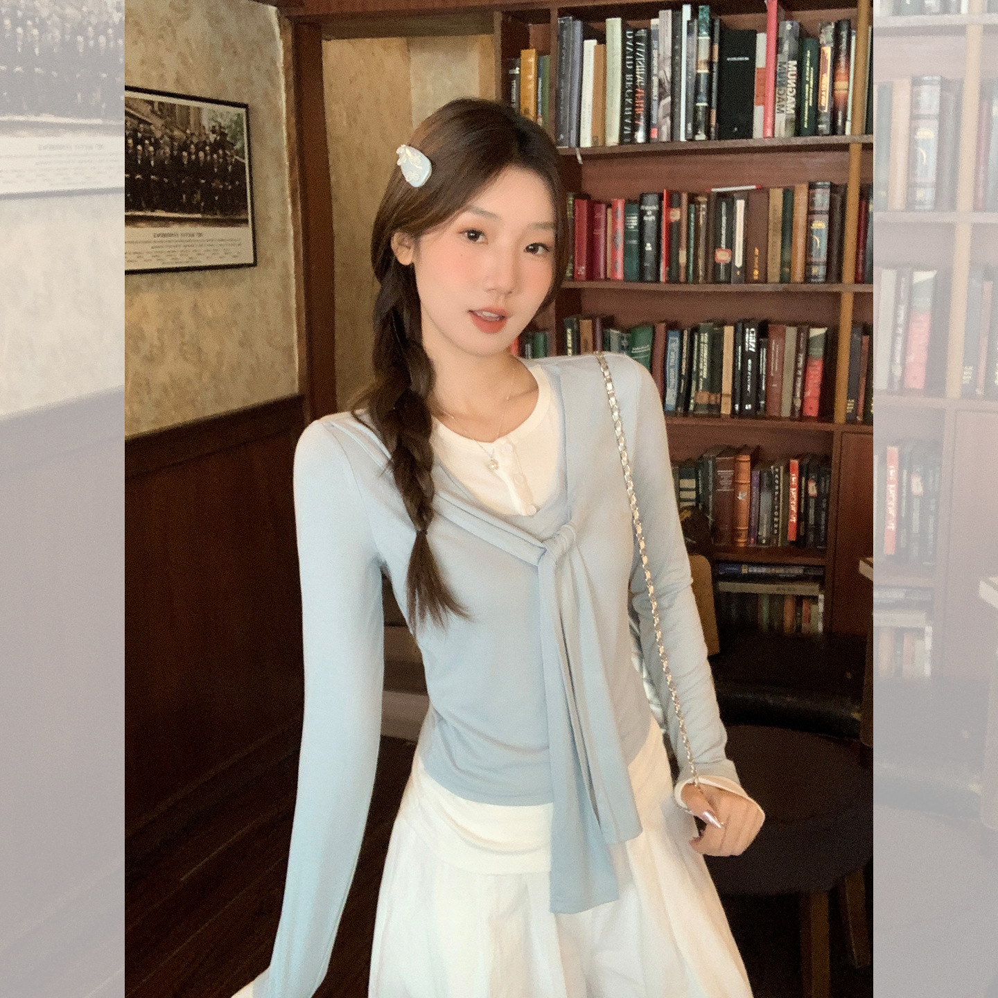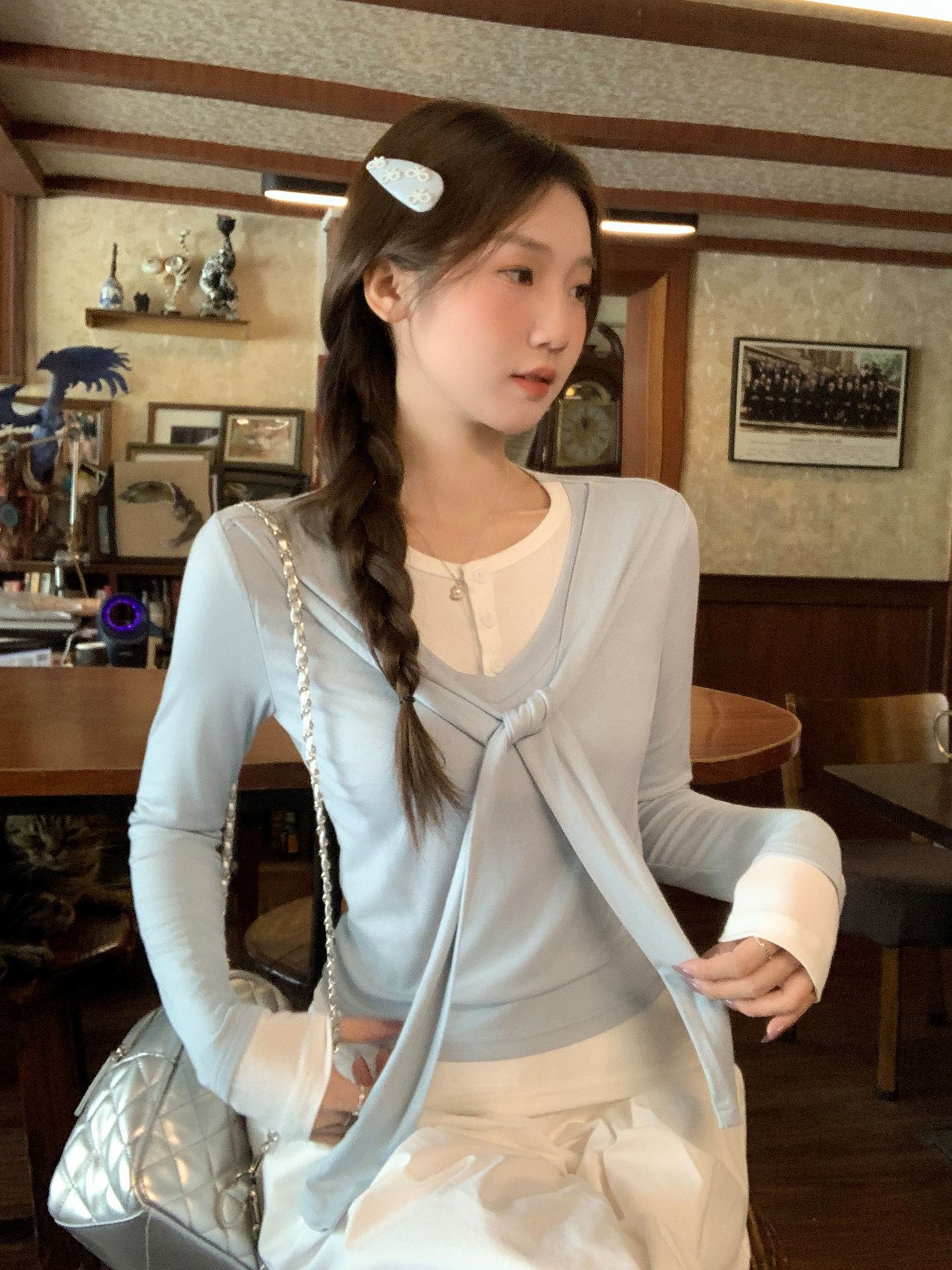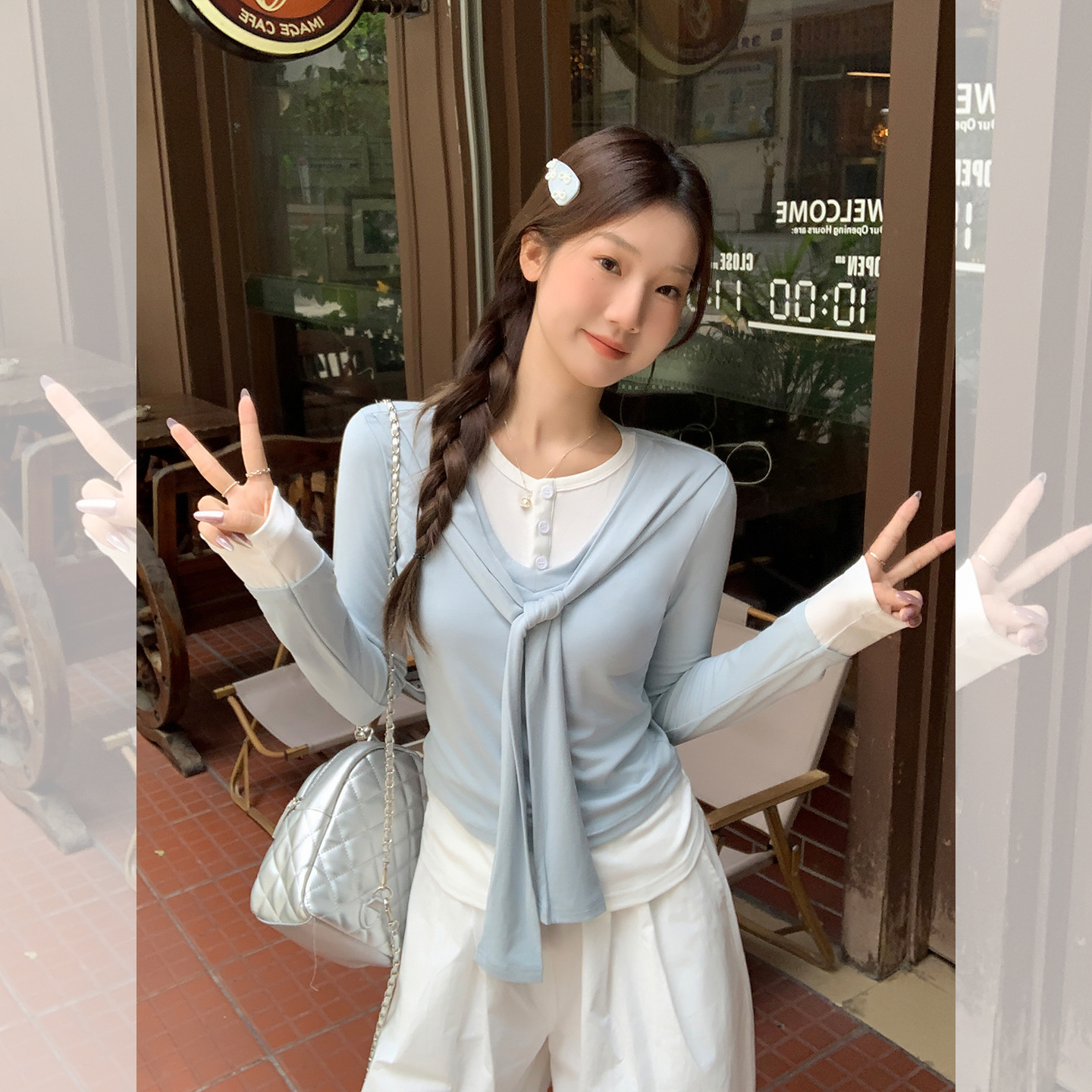 Product information: Pattern: color matching Color: blue Size: S,M,L Style: slim fit Sleeve length: long sleeve Popular elements: contrast color Style: False two-piece suit Style: sweet and spicy Craft: collage/stitching