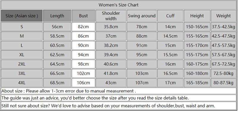 1. Asian sizes are 1 to 2 sizes smaller than European and American people. Choose the larger size if your size between two sizes. Please allow 2-3cm differences due to manual measurement.