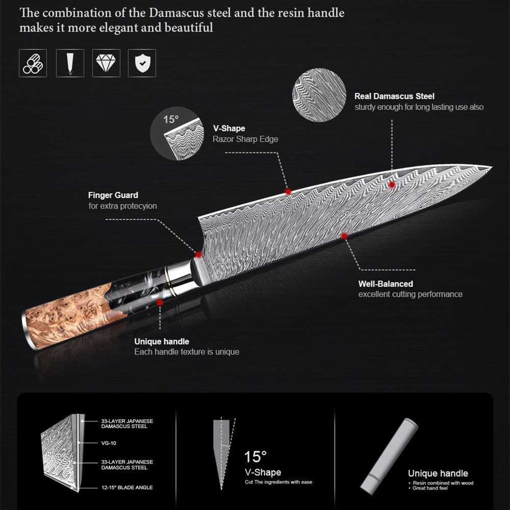 Blade material:67 layers Japanese VG10 Damascus SteelHandle material:stability wood and red resin handleHardness:60+2 HRCThickness:2.0mm