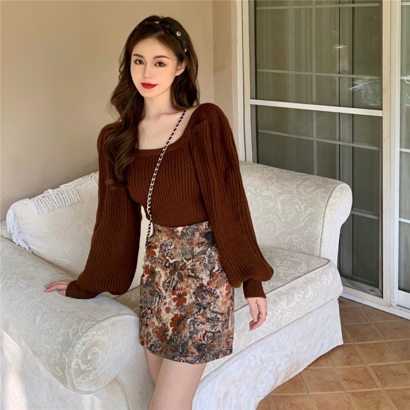 Color: One piece of brown sweater, one piece of oil painting flower skirt
