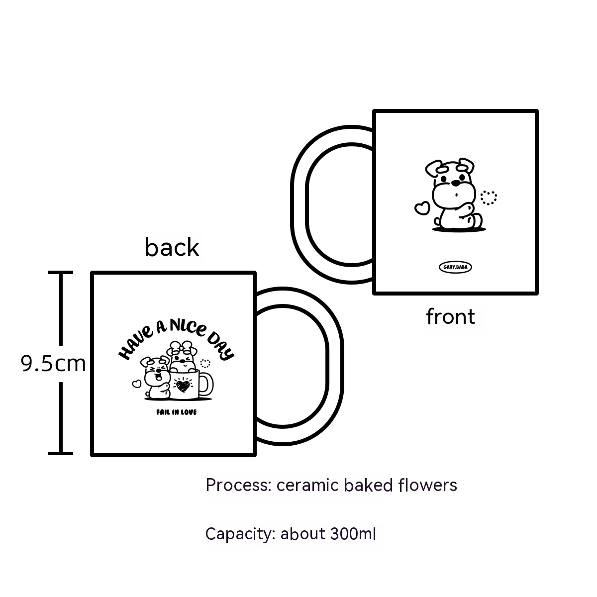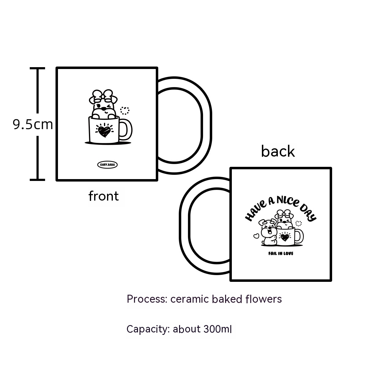 Material: CeramicCapacity: 300mL (included)Style: AmericanColor classification: couple cup (one pair), cream colored Gary, matte colored NiNi, couple cup+coaster