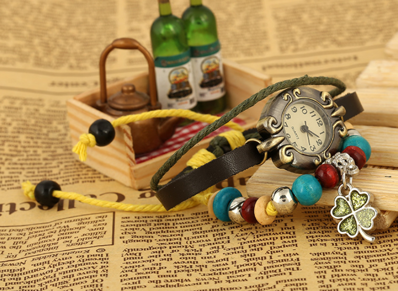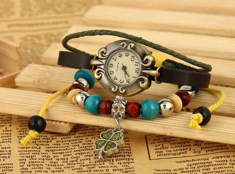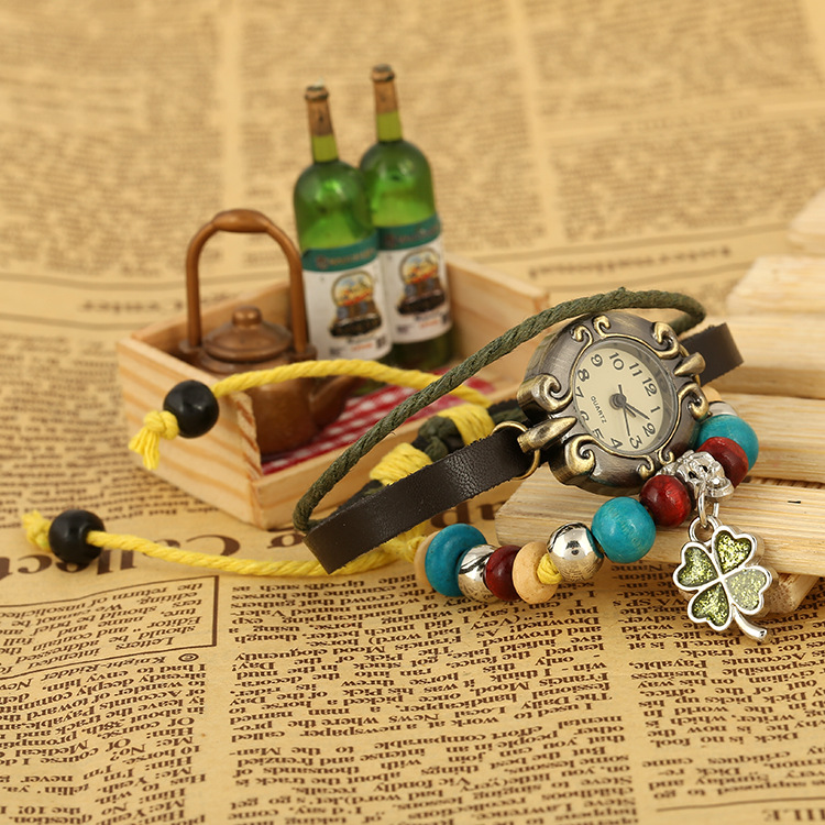 Sweet and lovely wind clover clover beaded leather bracelet girl leather bracelet watch student jewelry