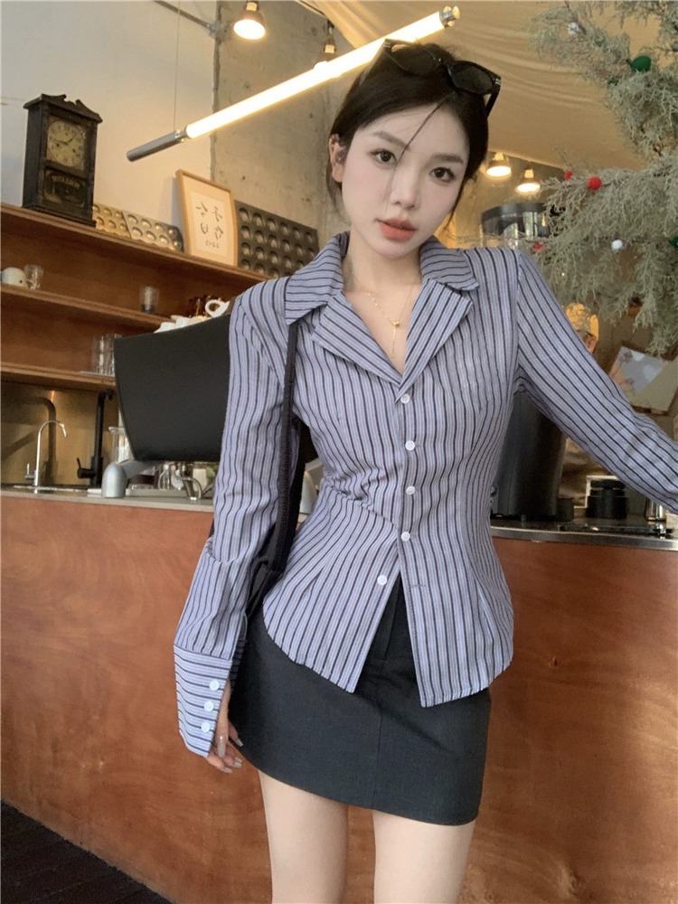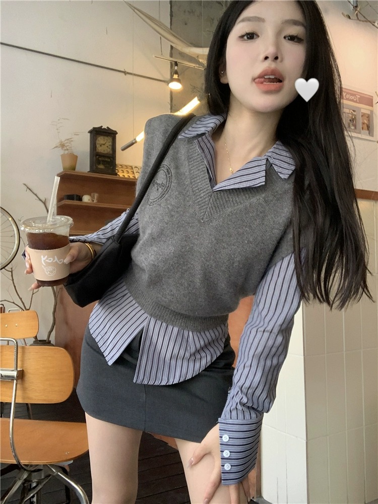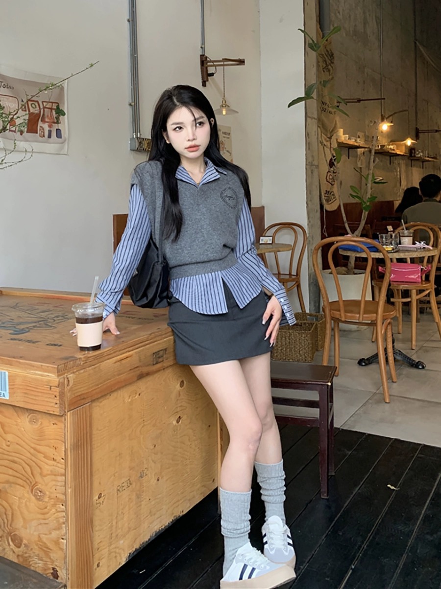 Color: gray skirt, gray vest, vest shirt, vest shirt skirt, striped shirt