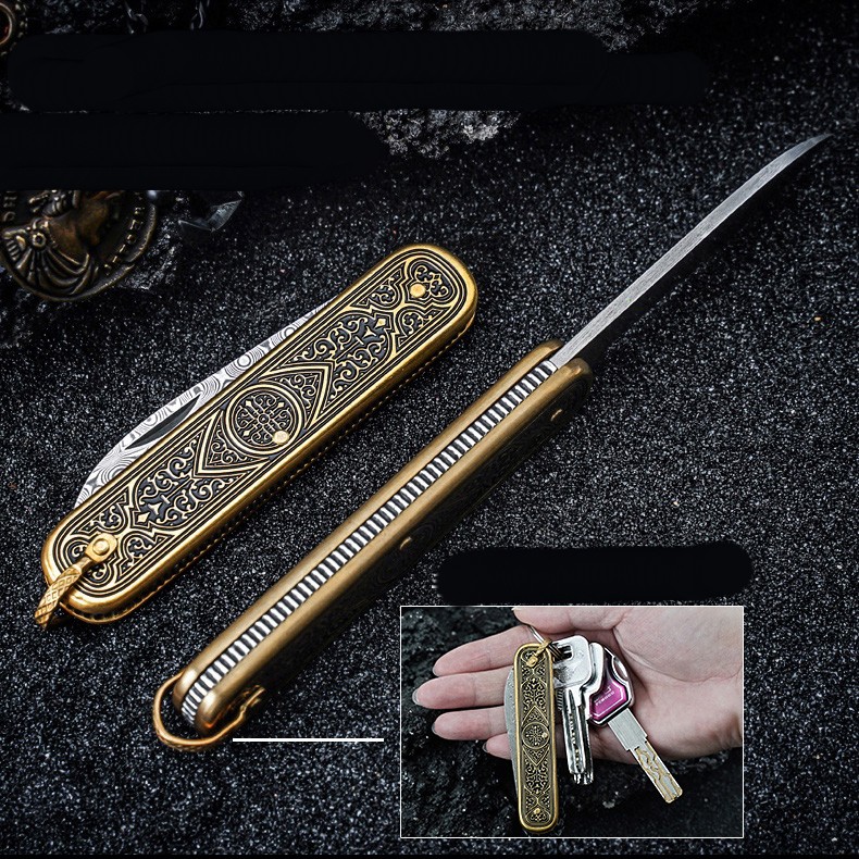 Material: Damascus steel with small rose patternKaramura: Brass sheetOverall length: 136mmBlade length: 40mmBlade thickness: 2.3mmPacking size: 9*13*4cm