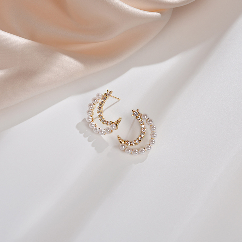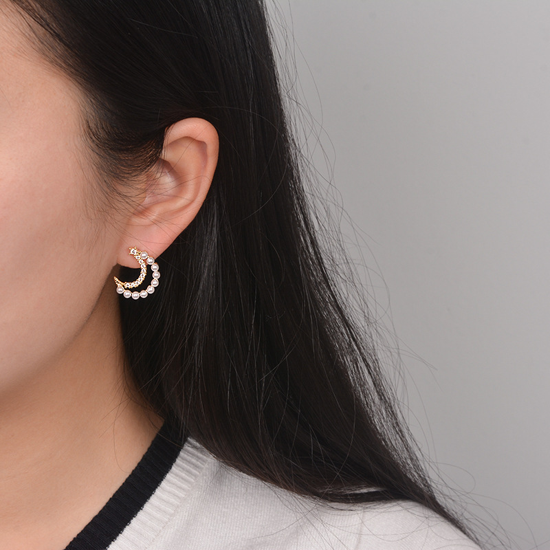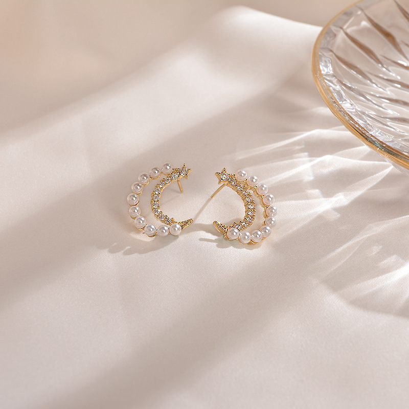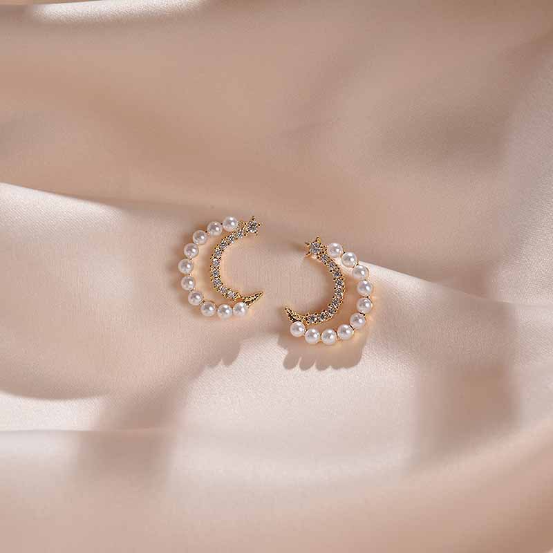 Moon Earrings girl''s heart delicate and small crescent Pearl Earrings super fairy sweet ins wind inlaid with Diamond Earrings