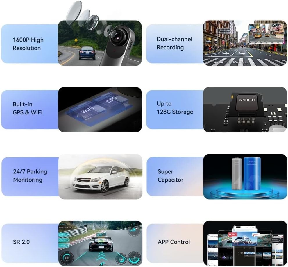 • **اتصال ذكي وتطبيق: ** تدعم الواي فاي المدمج للاتصال بتطبيق DDPAI، مما يتيح لك معاينة الفيديو مباشرة، تحميل المقاطع، وتغيير الإعدادات بسهولة عبر الهاتف.
